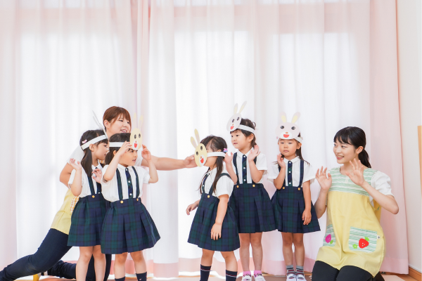 幼稚園の手づくり感あふれる大きな舞台で一人ひとりが役になりきって演じ、みんなで力を合わせる事の大切さや喜びを感じることができます。音楽あそび活動の集大成でもあります。